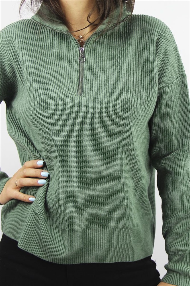 Джемпер второго слоя одежды, укороченный, со спущеной линией плеча, с рубашечным рукавом. Круглый вырез горловины обработан двойным воротником, высотой в г.в. 9,0+-0,3 см. Застежка - молния, тракторная, с металлическим, под черненое серебро брелоком "кольцо"(25см) .