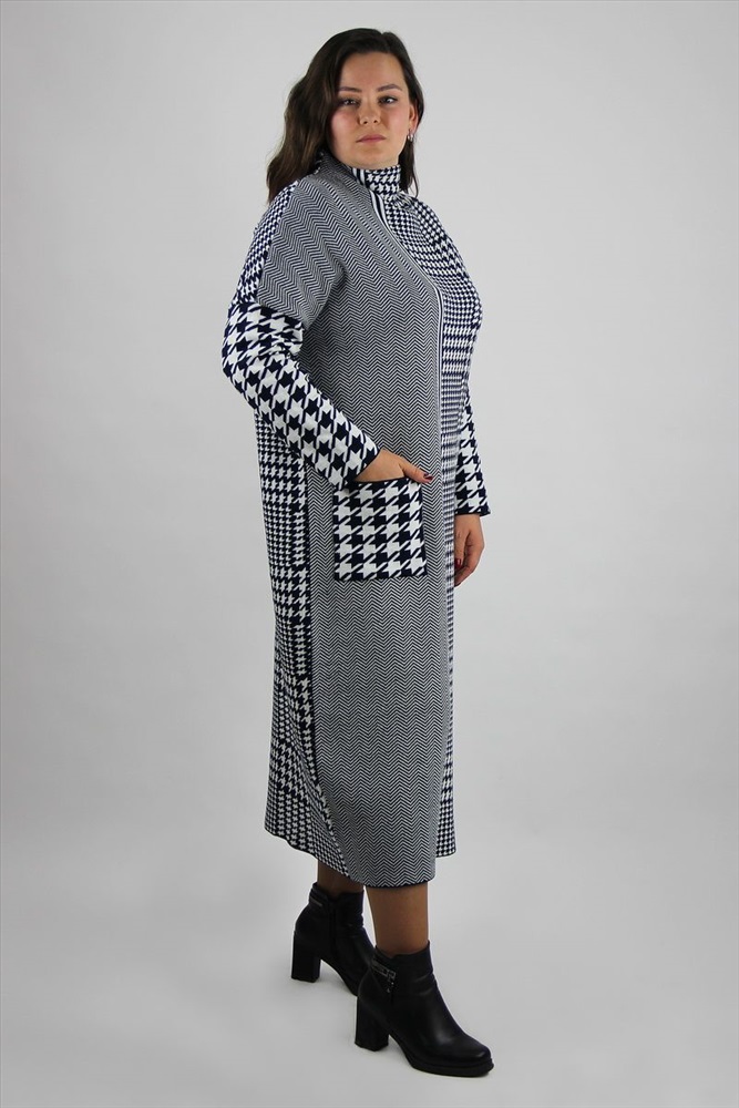Платье второго слоя одежды, зауженное к низу, со спущенным плечом, длинным рубашечным рукавом, цельнокроенным воротником-стойка, с накладным карманом.