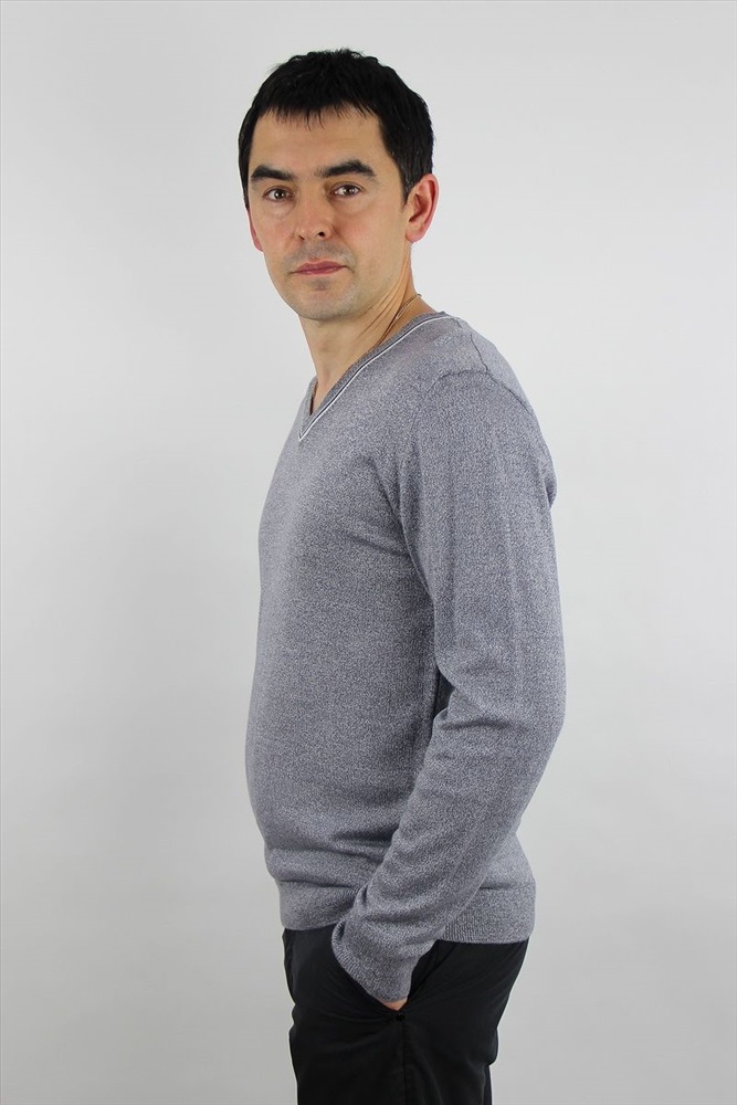 Изделие второго слоя одежды. Длинный втачной рукав, V-образная горловина, бейка в горловину высотой 2,5 см. сдвоенная кулирная гладь 1см +ластик 1х1