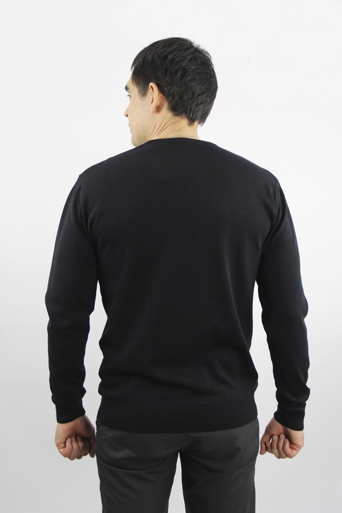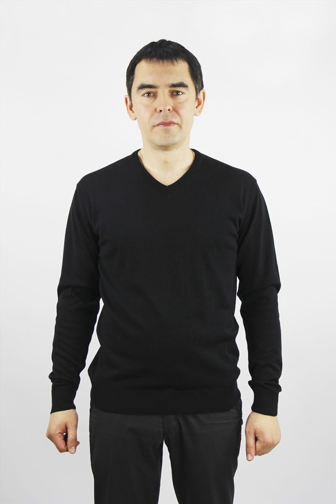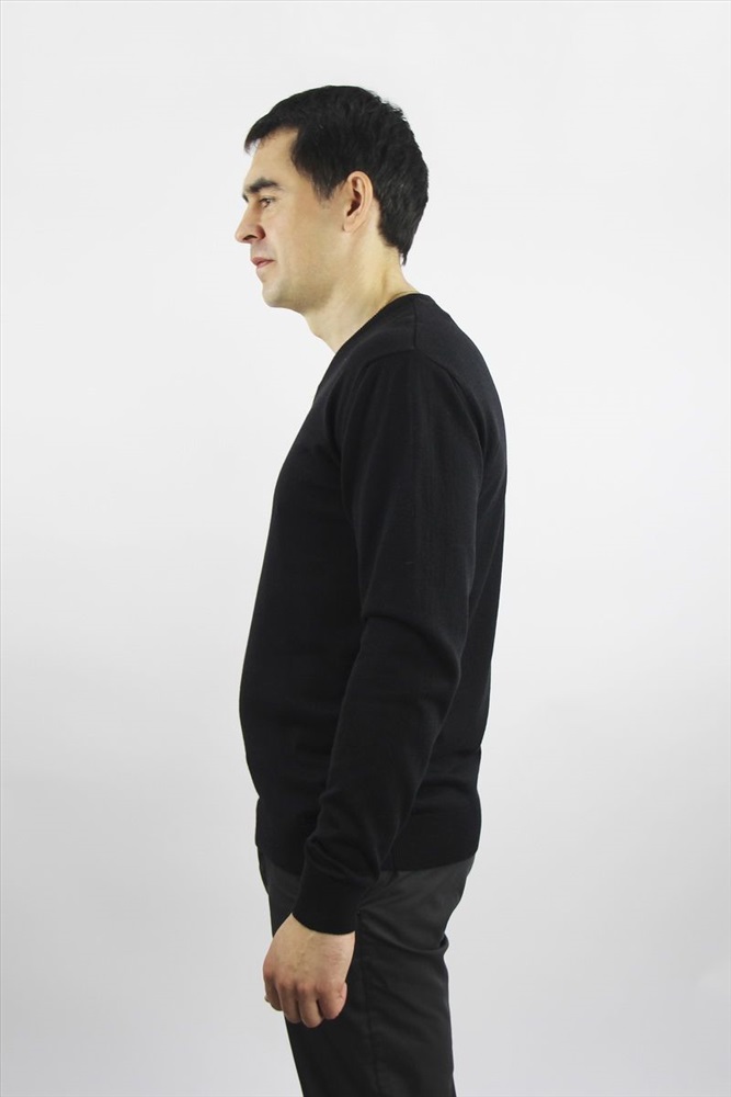 Джемпер мужской,второго слоя одежды,прямого силуэта, немного заужен книзу,с длинным втачным рукавом. У-образный вырез горловины обработан двойной ластичной бейкой.
