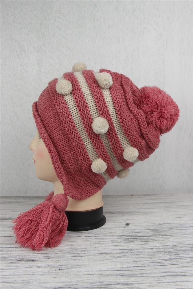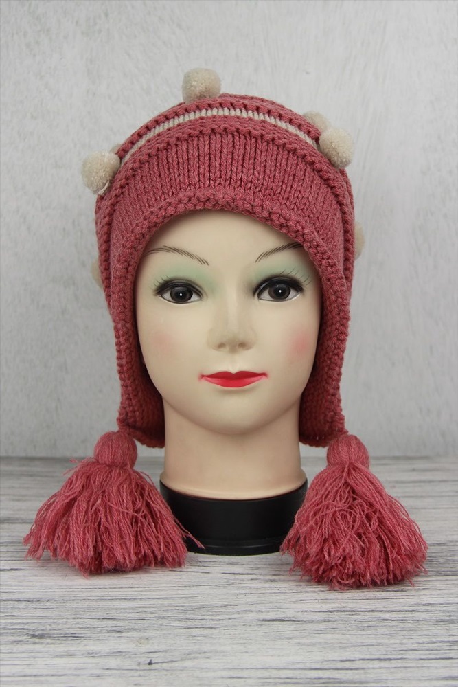 Шапка второго слоя одежды. Шапка с задним швом, верх собран на помпон диаметром 10см (по образцу). Концы шапки украшены декоративными кисточками длиной 10см. Нижний край шапки заработан закручивающим краем