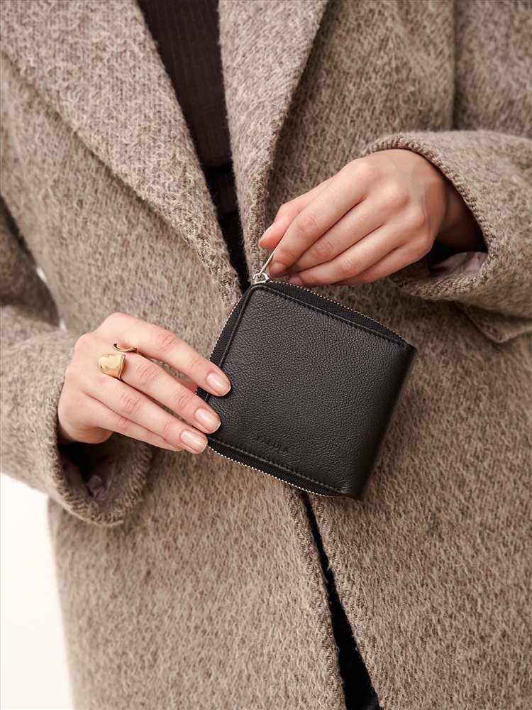 Компактное портмоне выполнено из натуральной кожи. Закрывается на металлическую молнию, внутри расположено отделение для купюр, отделение для мелочи закрывается на кнопку, 4 отделения для карт, а так же 1 вертикальный карман. Цвет фурнитуры:никель. Внутренний материал: подкладка. Внешний размер: 110х105х025. Упаковка: подарочная коробка.
