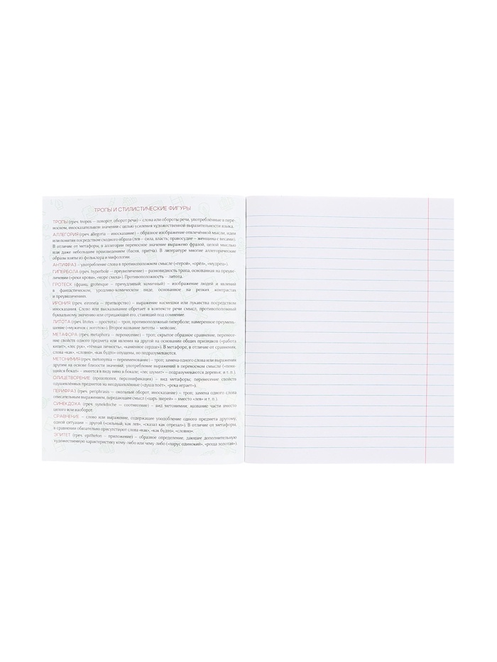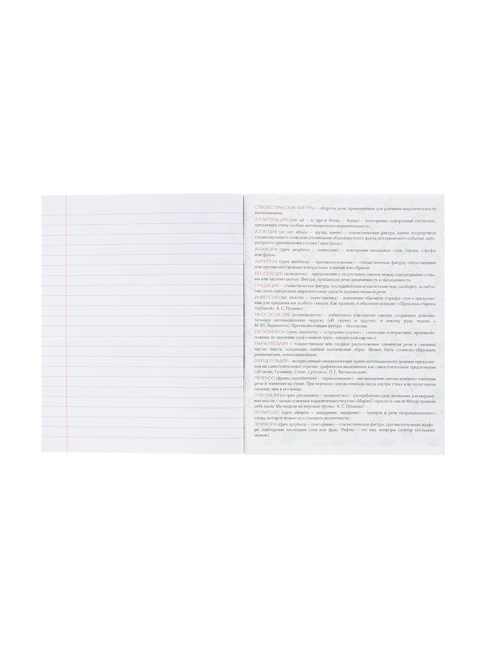 Тетрадь по литературе из серии «Школьный стиль» создаёт спокойное пространство для мыслей о произведениях, героях и авторских замыслах. Справочный материал внутри служит быстрым ориентиром. В плотном учебном ритме такая поддержка помогает сохранить уверенность и не тратить время на поиск базовых определений. Продуманная линовка делает запись плавной и аккуратной — особенно когда важно выразить собственную мысль точно.