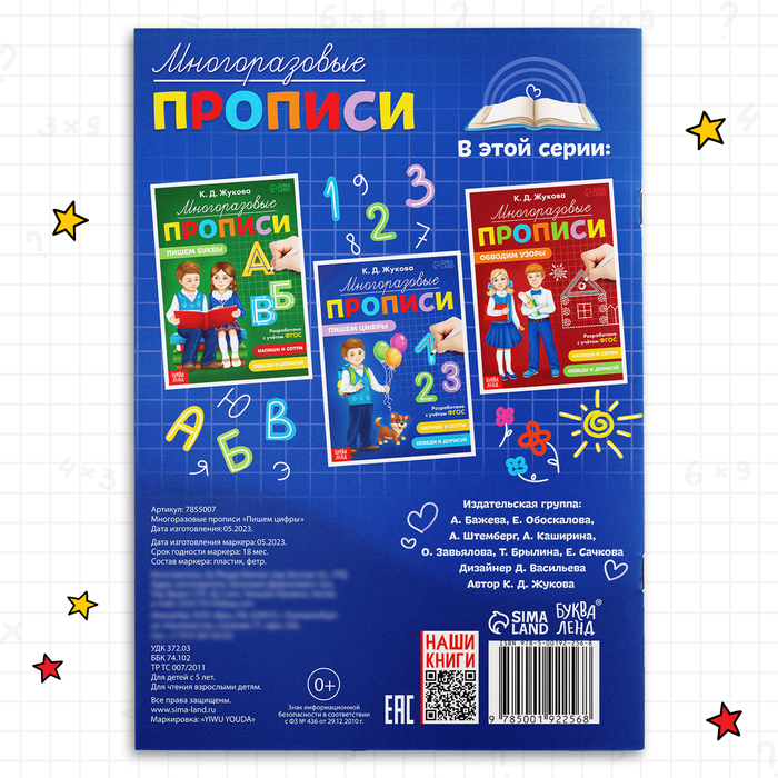 * Страницы прописи выполнены из бумаги со специальным покрытием, которое позволяет писать и стирать снова и снова.