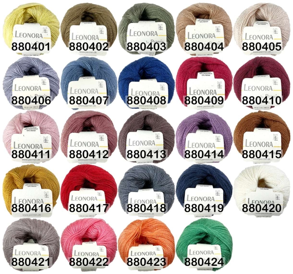 Благодаря особому составу Leonora представляет собой очень элегантную и современную пряжу, подходящую для всего: от шалей до детского трикотажа. Идеальный баланс между шелком и кид-мохером придает пряже глянцевый вид, она одновременно мягкая и легкая, при этом менее пушистая, чем классическая пряжа из шелка-мохера. Нежная тонкая нить, полотно из нее получится струящимся, с легким блеском за счет шелка в составе. Прекрасно будет держать ажурные узоры. Такую пряжу лучше взять на деревянных спицах, так как пряжа скользкая.
