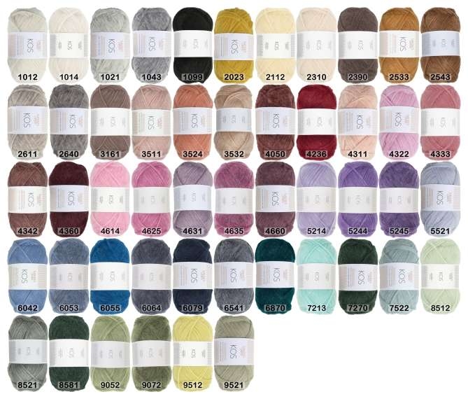 Цвет: 1012 БЕЛЫЙ, 1014 МЕЛ, 1021 СВ.СЕРЫЙ, 1043 СЕРЫЙ МЕЛАНЖ, 1099 ЧЕРНЫЙ, 2023 ЖЕЛТЫЙ, 2112 ЛИМОННЫЙ, 2310 СВЕТЛЫЙ МАРЦИПАН, 2390 КОРИЧНЕВЫЙ, 2533 СВЕТЛО-ЖЕЛТО-КОРИЧНЕВЫЙ, 2543 КОРИЧНЕВЫЙ САХАР, 2611 СВЕТЛО-БЕЖЕВЫЙ СОЛОДОВЫЙ, 2640 КОРИЧНЕВЫЙ МЕЛАНЖ, 3161 ЖЕЛУДЬ, 3511 ПУДРА РОЗОВАЯ, 3524 ТЕРРАКОТОВЫЙ, 3532 БЕЖЕВЫЙ, 4050 СВ.СЛИВА МЕЛАНЖ, 4236 ГЛУБОКИЙ КРАСНЫЙ, 4311 ПОСЫПАННЫЙ РОЗОВОЙ МУКОЙ, 4322 РОЗОВЫЙ, 4333 ДИКАЯ РОЗА, 4342 КАКАО, 4360 СЛИВА МЕЛАНЖ, 4614 РОЗОВЫЙ, 4625 МАЛИНА, 4631 ПЫЛЬНАЯ СИРЕНЬ, 4635 ЛИЛОВЫЙ, 4660 ВЕРЕСК, 5214 СИРЕНЬ, 5244 ФИАЛКА, 5245 ФИОЛЕТОВЫЙ, 5521 СВЕТЛО-ГОЛУБОЙ, 6042 Т.ГОЛУБОЙ, 6053 СВ.ДЖИНСА, 6055 ЯРКО-СИНИЙ, 6064 ДЖИНС, 6079 ТЕМНО-СИНИЙ, 6541 СЕРО СИНИЙ МЕЛАНЖ, 6870 Т.МОРСКАЯ ВОЛНА, 7213 ТИФФАНИ, 7270 ЗЕЛЕНЫЙ МЕЛАНЖ, 7522 ЛЕД, 8512 МЯТА, 8521 ПЫЛЬНЫЙ СВЕТЛО-ЗЕЛЕНЫЙ, 8581 ГЛУБОКАЯ ЛЕСНАЯ ЗЕМЛЯ, 9052 ШАЛФЕЙ, 9072 БОЛОТНЫЙ, 9512 НЕЗРЕЛЫЙ ЛИМОН, 9521 ПЫЛЬНАЯ ФИСТАШКА