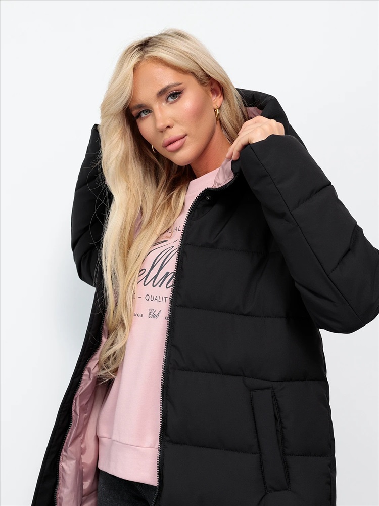 Длинный стильный пуховик прямого кроя с глубоким капюшоном.