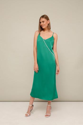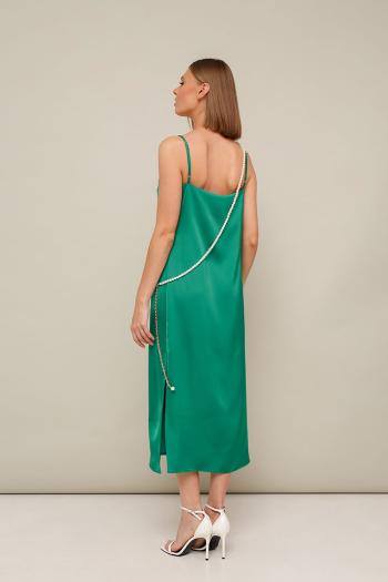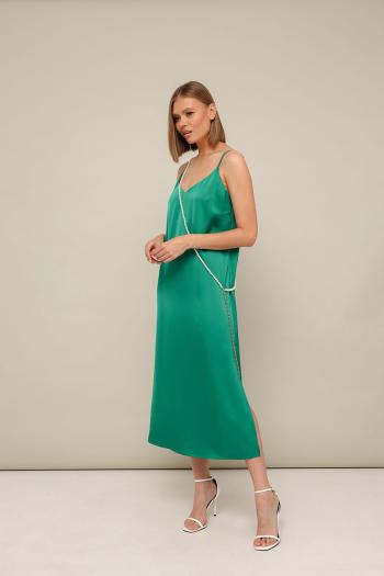 Платье-комбинация полуприлегающего силуэта из струящейся ткани с благородным матовым блеском. Перед с нагрудными вытачками. В боковых швах по низу обработаны высокие разрезы. Бретели регулируются по длине. В комплекте к платью прилагается жемчужная цепочка. Платье без подкладки. Комментарии к товару