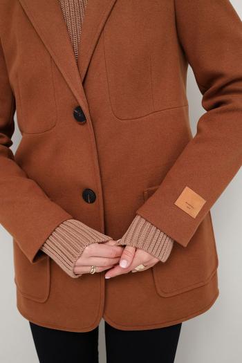 Стильный жакет полуприлегающего силуэта, выполнен из костюмной ткани. Воротник пиджачного типа с отложными лацканами. Застежка центральная на петли и пуговицы. Спереди обработаны накладные карманы, в области груди подрезы с нагрудными вытачками. Спинка с рельефами и средним швом, переходящим в шлицу. Рукава втачные двухшовные, на левом рукаве декоративная нашивка. Изделие на подкладке.