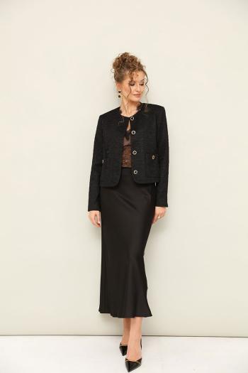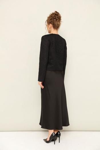Элегантный комплект состоит их укороченного жакета и юбки. Жакет укороченный,застегивается на пуговицы, выполнен из двух тканей: ажурное кружево и сатин. Юбка полуприлегающего силуэта,застегивается на потайную молнию сбоку, выполнена из великолепного гладкого сатина. Комментарии к товару