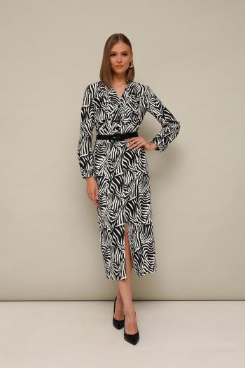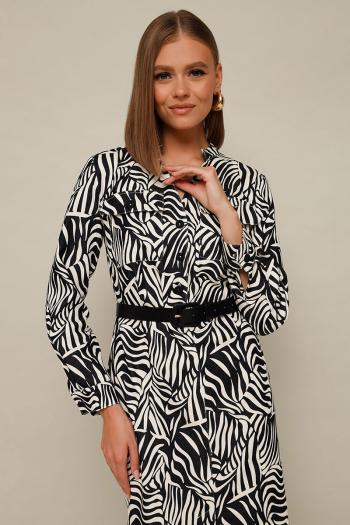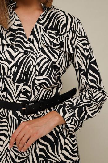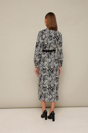 Женское платье полуприлегающего силуэта, отрезное по линии талии, выполнено из джинсовой ткани с анималистичным принтом. Фигурный вырез горловины с притачным воротником-стойкой. Лиф с центральной застежкой на петли ,пуговицы и с накладными карманами с клапанами. Юбка с разрезом в среднем шве, который обеспечивает свободу движения. Рукава втачные с притачной манжетой с застежкой на пуговицы. Спинка с талиевыми вытачками. В комплекте прилагается ремень. Комментарии к товару