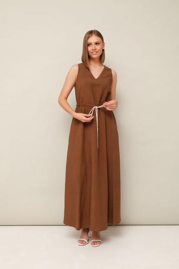 Платье выполнено из натуральной ткани с содержанием вискозы и льна. Горловина V-образной формы. По линии талии настрочная кулиса с хлопковым шнуром. В боковых швах обработаны карманы. Платье без подкладки. Комментарии к товару
