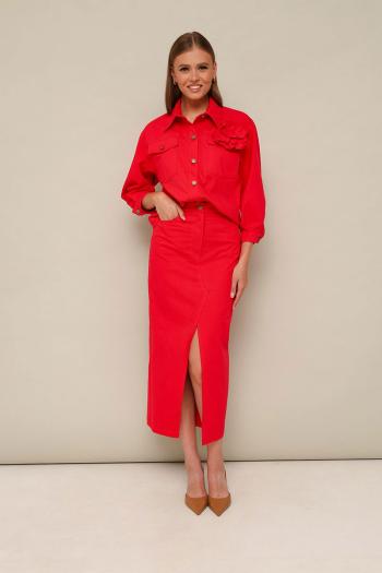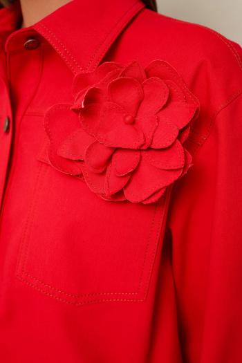 Стильный 2-предметный комплект, состоящий из жакета и юбки из джинсовой ткани. Жакет прямого силуэта с центральной застежкой на петли, пуговицы, с кокеткой и накладными карманами с клапанами. Воротник рубашечный с отрезной стойкой. Рукава со спущенной линией втачивания плеча, длина ¾, с притачной манжетой и застежкой на пуговицы. Спинка с кокеткой и средним швом. Юбка в длине миди с посадкой на талии. Пояс притачной с застежкой на пуговицу и тесьму-молнию, предусмотрены шлевки. Для удобства движения спереди обработан разрез. В комплекте прилагается съемная брошь-цветок из основной ткани. Комментарии к товару