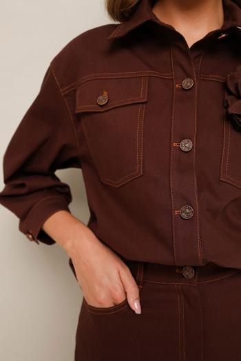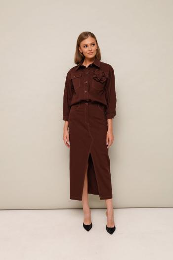 Стильный 2-предметный комплект, состоящий из жакета и юбки из джинсовой ткани. Жакет прямого силуэта с центральной застежкой на петли, пуговицы, с кокеткой и накладными карманами с клапанами. Воротник рубашечный с отрезной стойкой. Рукава со спущенной линией втачивания плеча, длина ¾, с притачной манжетой и застежкой на пуговицы. Спинка с кокеткой и средним швом. Юбка в длине миди с посадкой на талии. Пояс притачной с застежкой на пуговицу и тесьму-молнию, предусмотрены шлевки. Для удобства движения спереди обработан разрез. В комплекте прилагается съемная брошь-цветок из основной ткани. Комментарии к товару