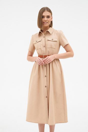 Элегантное платье из бежевого джинса средней плотности. Прямого силуэта,длина миди, застегивается на пуговицы по груди. Спереди по низу неглубокий разрез,что добавляет элегантности и женственности этой модели.Ремень в комплекте.