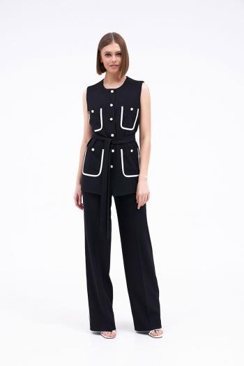 Элегантный 2-х предметный комплект, состоящий их жилета и брюк. Жилет полуприлегающего силуэта с центральной застежкой на петли и пуговицы. Спереди обработаны накладные карманы по линии груди и в области бедер с контрастной окантовкой. Жилет дополнен поясом. Срез обтачки спинки и подборта окантован, без подкладки. Брюки с посадкой на талии, прямого силуэта. В боковых швах контрастный кант. По центру задних половинок застежка на потайную молнию. Комментарии к товару