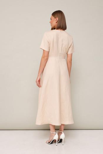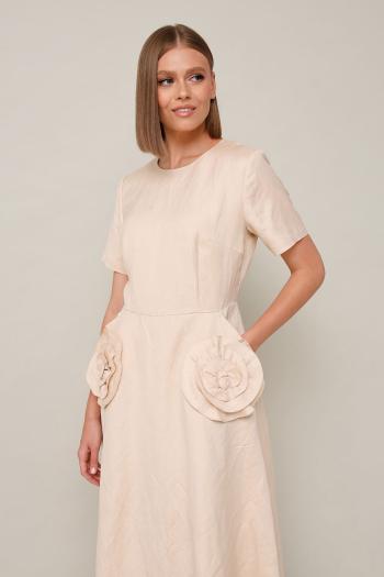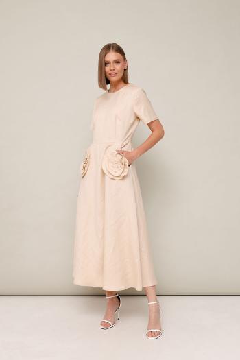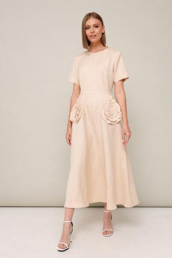 Эффектное платье, отрезное по линии талии с юбкой А-образного силуэта. Горловина округлой формы. Боковые наклонные карманы, декорированные элементами из основной ткани в виде цветка. Застежка по спинке в среднем шве на потайную молнию. Платье без подкладки. Комментарии к товару