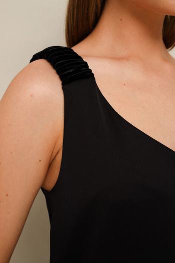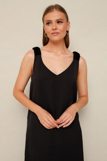 Лаконичное платье в длине миди, выполнено из струящейся ткани с благородным матовым блеском. V-образный вырез горловины переда и спинки. Бретели на резинке со сборкой из отделочной бархатной ткани. В боковых швах обработаны карманы. Спинка со средним швом. Изделие без подкладки