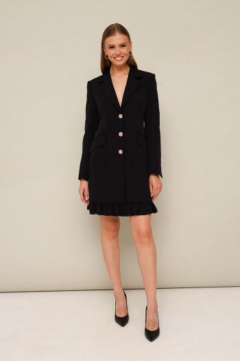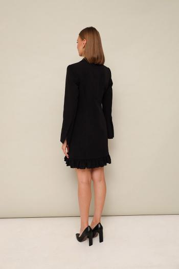 Стильное платье полуприлегающего силуэта, выполнено из костюмно-плательной ткани. Застёжка центральная на петли и пуговицы, внутри платье фиксируется на потайную пуговицу. Воротник пиджачного типа с отложными лацканами. Перед платья с рельефами и наклонными карманами с клапанами в рамку. Рукава втачные с высокими шлицами по низу. Низ платья с оборкой в 2 ряда из отделочной ткани. Спинка с рельефами и средним швом. Изделие на подкладке. Комментарии к товару