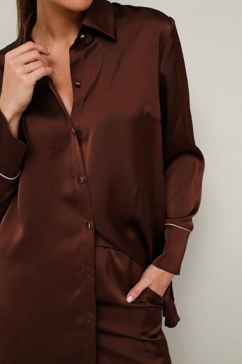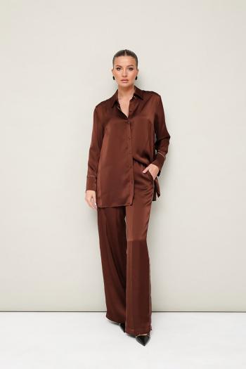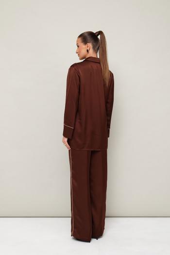 Женский комплект, состоящий из рубашки и брюк, выполнен из струящейся ткани с благородным матовым блеском. Рубашка современного прямого силуэта с центральной застежкой на петли и пуговицы. Горловина с рубашечным воротником на притачной стойке. Рукава со спущенной линией втачивания плеча с притачной манжетой. Брюки прямого силуэта с боковыми наклонными карманами. Пояс притачной на резинке, для регуляции размера. По манжете рубашки и в боковом шве брюк обработан кант. Комментарии к товару