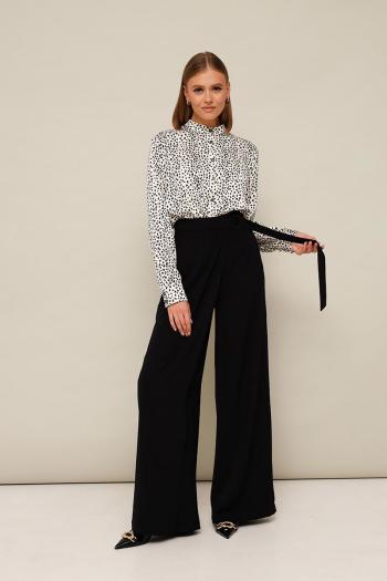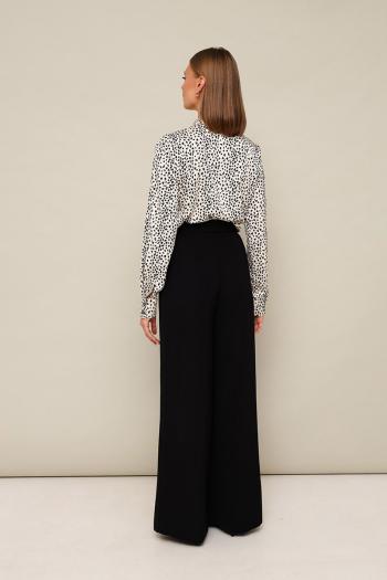Комплект 2-предметный, состоящий из блузки и брюк. Блузка прямого кроя, с притачным воротником-стойкой по горловине. Застежка центральная на петли и пуговицы. Рукава длинные с притачными манжетами. В боковых швах по низу обработаны разрезы. Брюки-кюлоты современного силуэта, расширенные к низу, с заутюженными стрелками. Спереди брюки обработаны на запах с застежкой на полукольца, притачной пояс - на пуговицу и тесьму-молнию. Комментарии к товару
