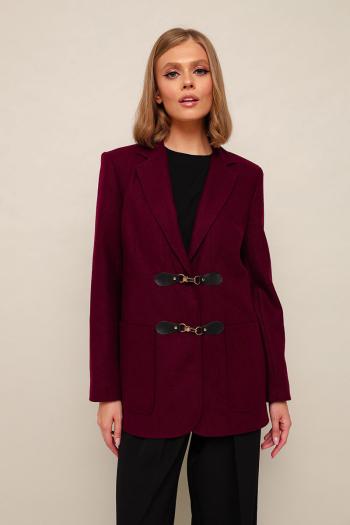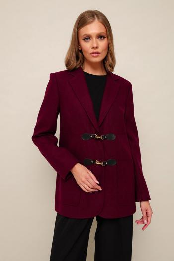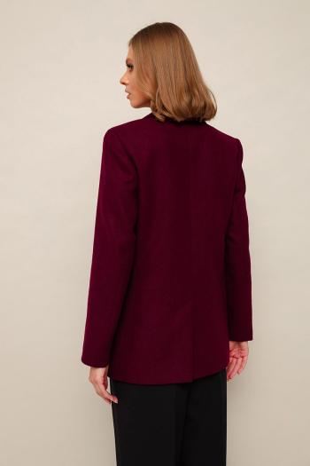 Стильный жакет полуприлегающего силуэта, выполнен из полушерсти. Застежка центральная на декоративные крючки и потайные кнопки. Воротник пиджачного типа с отложными лацканами. Спереди обработаны накладные карманы, в области груди подрезы с нагрудными вытачками. Спинка с рельефами и средним швом переходящим в шлицу. Рукава втачные двухшовные. Изделие на подкладке.