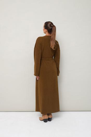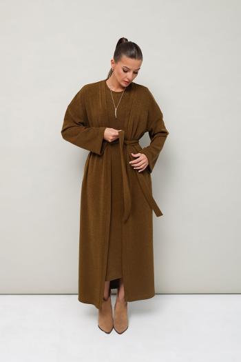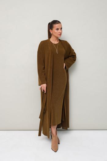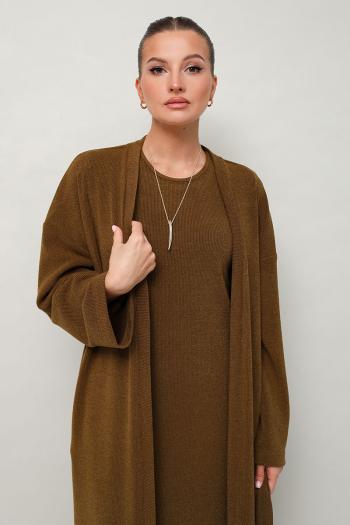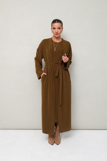 Женский комплект, состоящий из кардигана и платья, выполнен из мягкого уютного трикотажного полотна. Горловина спинки и борта обработаны притачной планкой. Длинные рукава со спущенной линией втачивания плеча. В боковых швах внутренние карманы. Трикотажное платье полуприлегающего силуэта в длине миди. Округлый вырез горловины. Рукава втачные в длине до локтя. В левом боковом шве обработан высокий разрез. В комплекте прилагается пояс из основной ткани. Комментарии к товару