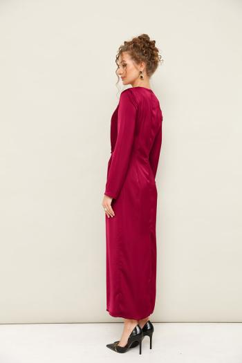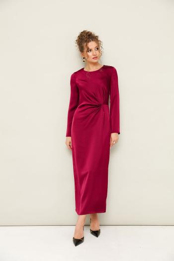 Вечернее платье полуприлегающего силуэта, выполнено из струящейся ткани с благородным матовым блеском. Горловина округлой формы. В области талии заложены складки, плавно переходящие в драпировку. Рукава втачные длинные. Застежка в среднем шве спинки на тесьму молнию. Для удобства движения сзади обработан разрез. Комментарии к товару