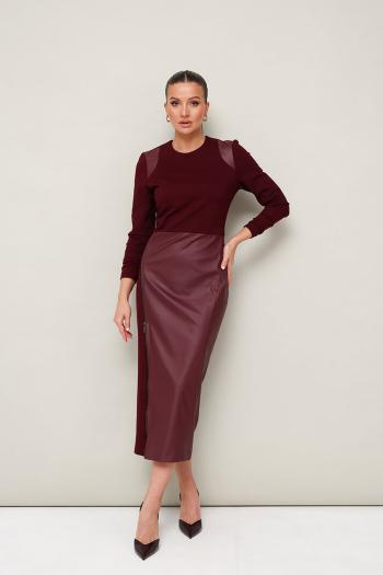 Стильное платье прилегающего силуэта, отрезное по линии талии, выполнено из экокожи и трикотажного полотна. Горловина округлой формы. Длинные втачные рукава. Юбка спереди с подрезом на металлическую молнию, с возможностью регулировать высоту разреза. Застёжка по спинке в среднем шве на потайную молнию.