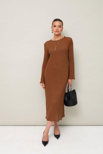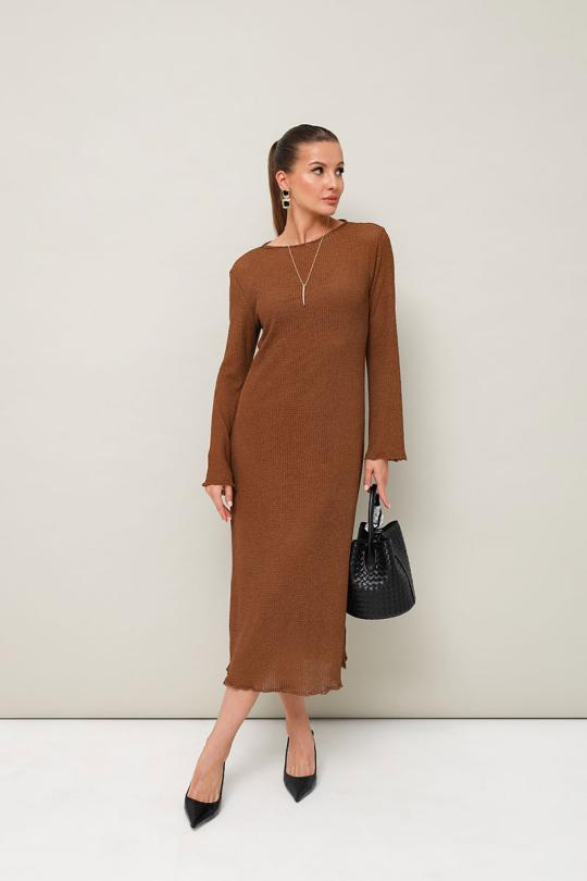 Стильное платье полуприлегающего силуэта из структурного трикотажа. Вырез горловины – лодочка. Рукава длинные, со спущенной линией втачивания плеча, слегка расширенные к низу. В комплекте прилагается нижнее платье-комбинация на бретельках с регуляторами из эластичного полотна.