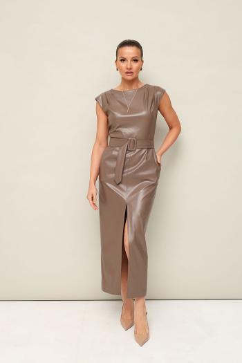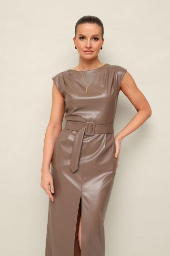 Стильное платье отрезное по линии талии в длине миди, выполнено из экокожи. Округлый вырез горловины. По плечевым швам лифа и по талии обработаны защипы. Юбка со средним швом, переходящим в разрез. Спинка в V-образным вырезом. В среднем шве застёжка на потайную тесьму молнию. В комплекте прилагается пояс из основной ткани с обтяжной пряжкой. Комментарии к товару