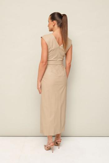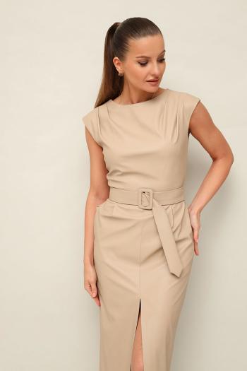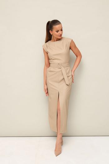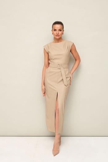 Стильное платье отрезное по линии талии в длине миди, выполнено из экокожи. Округлый вырез горловины. По плечевым швам лифа и по талии обработаны защипы. Юбка со средним швом, переходящим в разрез. Спинка в V-образным вырезом. В среднем шве застёжка на потайную тесьму молнию. В комплекте прилагается пояс из основной ткани с обтяжной пряжкой.