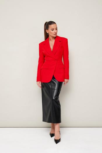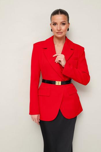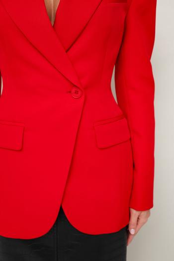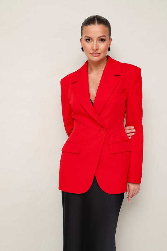 Силуэтный жакет с подчеркнутой линией талии. Смещенная застежка на петлю и пуговицу. Воротник пиджачного типа с отложными лацканами, край борта скругленный по низу жакета. Спереди обработаны прорезные карманы в рамку с клапанами и нагрудный прорезной карман с листочкой. Рукава втачные, двухшовные с отлетнымм шлицами. Спинка с рельефами и средним швом, переходящим в шлицу. Изделие на подкладке. Комментарии к товару