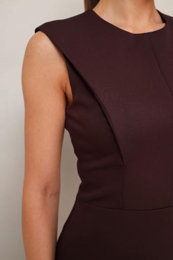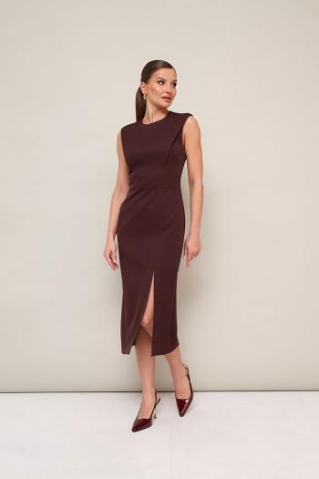 Лаконичное платье прилегающего силуэта, отрезное по талии, выполнено из плательной ткани. Округлый вырез горловины. Лиф по переду и спинке с конструктивными складками в рельефах. Юбка с высоким разрезом по левой стороне. Застежка в среднем шве спинки на потайную молнию. Платье обработано подкладкой. Комментарии к товару