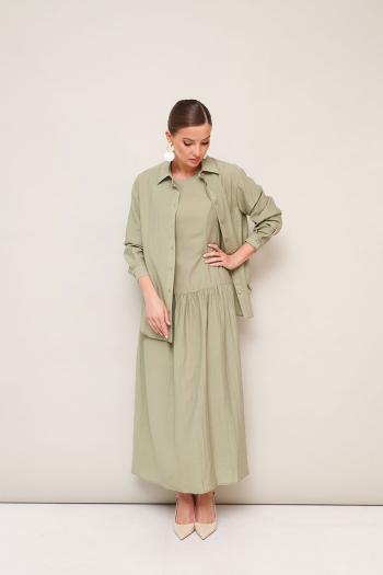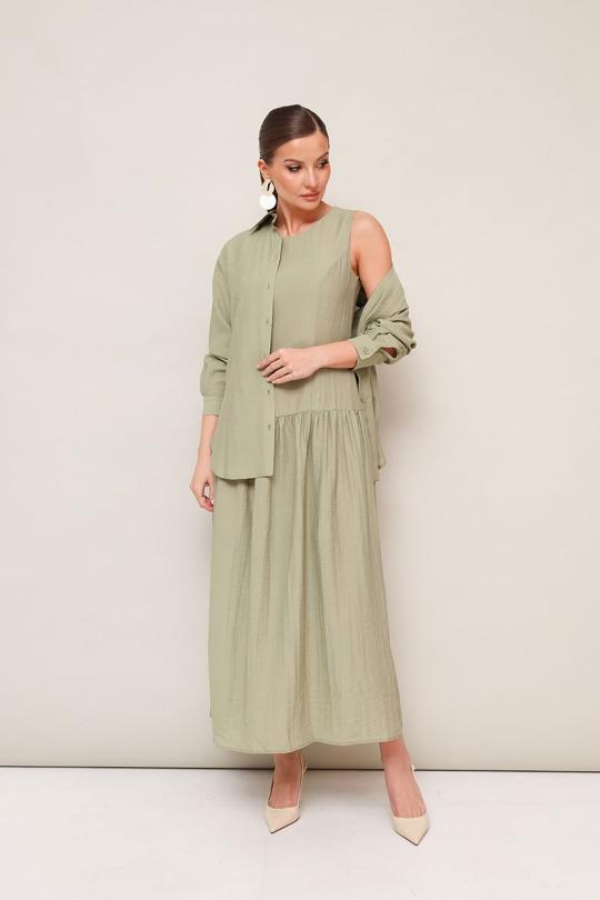 Элегантный 2-предметный комплект, состоящий из платья и блузки. Платье отрезное ниже линии талии. Округлый вырез горловины. Лиф с рельефными швами, спинка с центральной застежкой на потайную молнию. Юбка с легкой сборкой по шву притачивания. Платье на хлопковой подкладке. Блузка прямого кроя, горловина с рубашечным воротником со стойкой. Застежка центральная на петли и пуговицы. Спущенная линия втачивая рукава, манжеты с застежкой на пуговицы. В боковых швах обработаны фигурные разрезы. Спинка с отрезной кокеткой и встречной складкой. Комментарии к товару