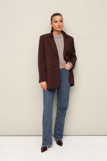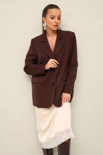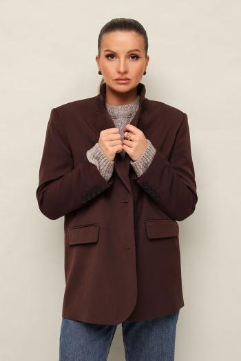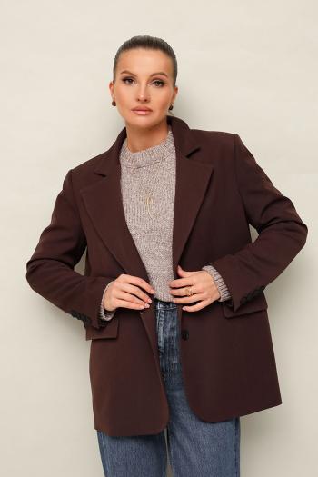 Жакет актуального прямого кроя, выполнен из костюмной ткани. Воротник пиджачного типа с отложными лацканами, край борта скругленный по низу жакета. Спереди обработаны прорезные карманы в рамку с клапанами. Рукава втачные двухшовные со шлицей и пуговицами. Спинка со средним швом, переходящим в высокую шлицу с застежкой на петли и пуговицы. Жакет на подкладке. Комментарии к товару