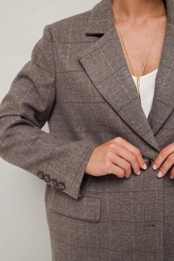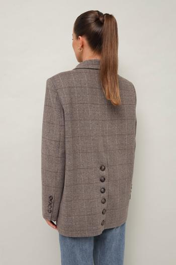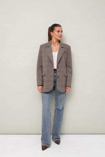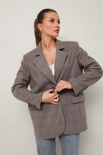 Жакет актуального прямого кроя, выполнен из костюмной ткани. Воротник пиджачного типа с отложными лацканами, край борта скругленный по низу жакета. Спереди обработаны прорезные карманы в рамку с клапанами. Рукава втачные двухшовные со шлицей и пуговицами. Спинка со средним швом, переходящим в высокую шлицу с застежкой на петли и пуговицы. Жакет на подкладке. Комментарии к товару
