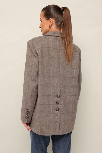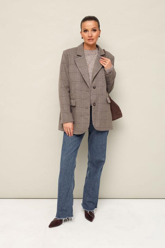 Жакет актуального прямого кроя, выполнен из костюмной ткани. Воротник пиджачного типа с отложными лацканами, край борта скругленный по низу жакета. Спереди обработаны прорезные карманы в рамку с клапанами. Рукава втачные двухшовные со шлицей и пуговицами. Спинка со средним швом, переходящим в высокую шлицу с застежкой на петли и пуговицы. Жакет на подкладке.