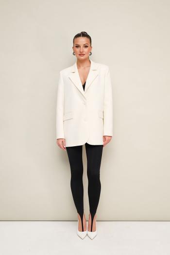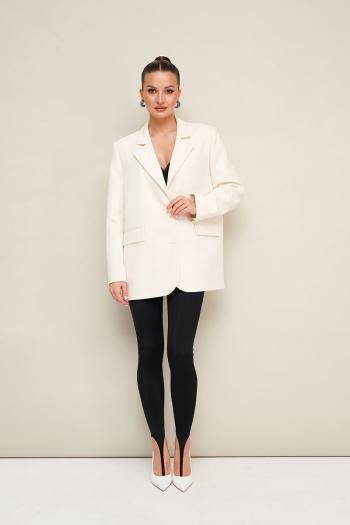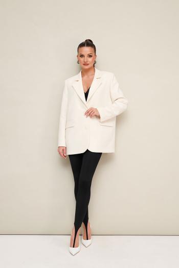 Жакет актуального прямого кроя, выполнен из костюмной ткани. Воротник пиджачного типа с отложными лацканами, край борта скругленный по низу жакета. Спереди обработаны прорезные карманы в рамку с клапанами. Рукава втачные двухшовные со шлицей и пуговицами. Спинка со средним швом, переходящим в высокую шлицу с застежкой на петли и пуговицы. Жакет на подкладке. Комментарии к товару