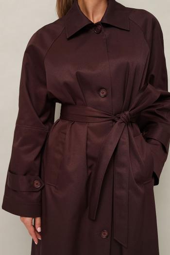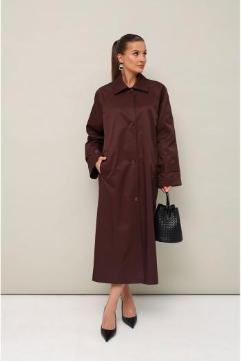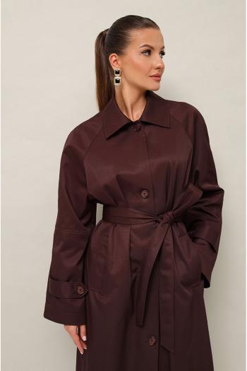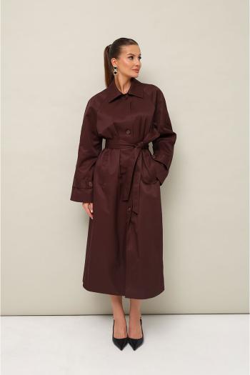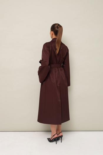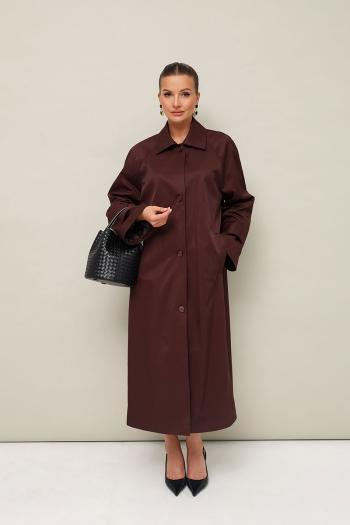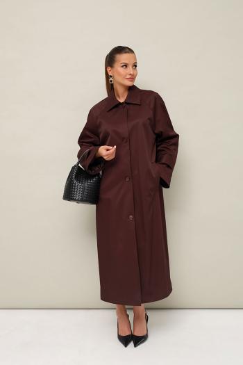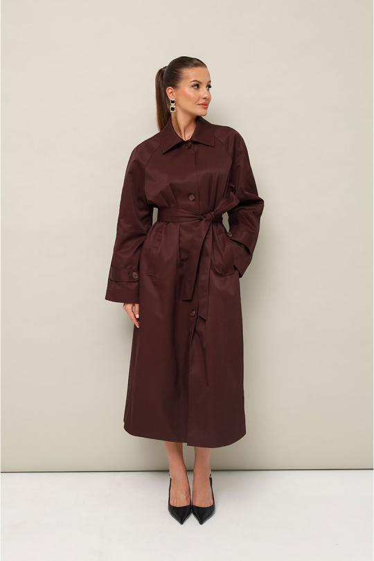 Плащ в длине миди, выполнен из ткани с водоотталкивающей и грязеотталкивающей обработкой. Силуэт слегка расширенный к низу. Отложной воротник с цельнокроеной стойкой. Центральная застёжка на петли и пуговицы. Спереди функциональные карманы-листочки. Рукава кроя реглан, по низу обработаны паты с застежкой на пуговицы. Спинка со средним швом со шлицей по низу. Плащ на подкладке. В комплекте прилагается пояс из основной ткани. Комментарии к товару