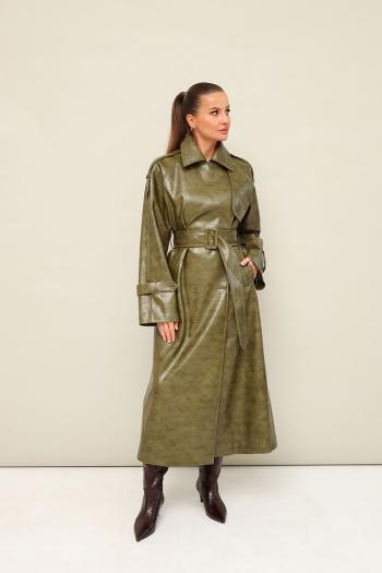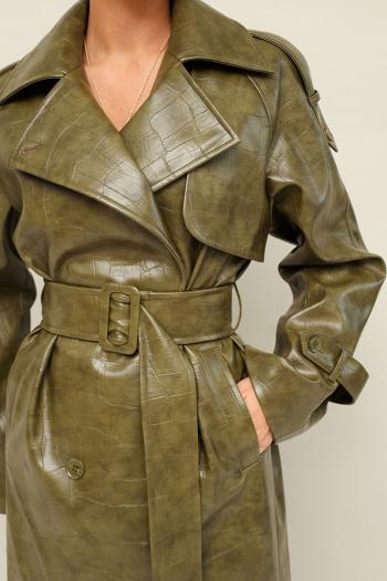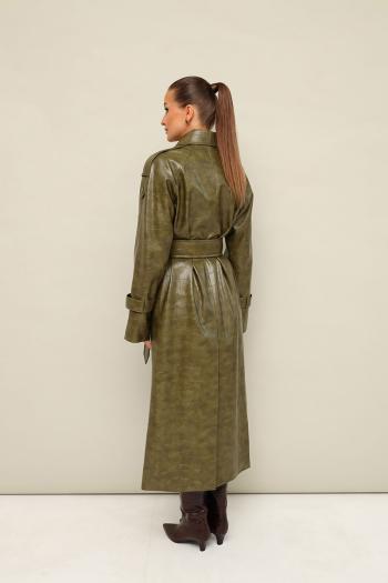 Плащ актуального прямого силуэта, выполнен из плотной экокожи с тиснением. Воротник пиджачного типа с отложными лацканами. Двубортная застёжка на петли и пуговицы. По плечевому шву обработаны погоны. Спереди отлетная кокетка и наклонные карманы с листочкой. Рукава кроя реглан, с патами по низу, с фиксацией на пуговицы. Спинка со средним швом. Для удобства движения сзади обработана шлица. Тренч на подкладке. В комплекте пояс из основной ткани с пряжкой.