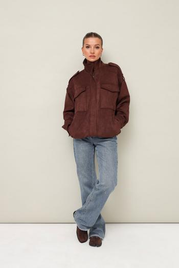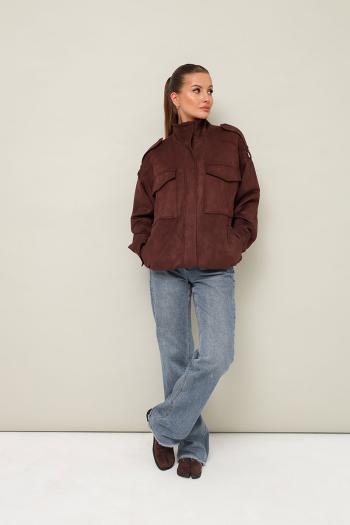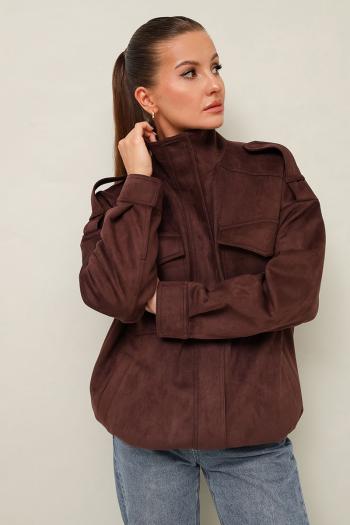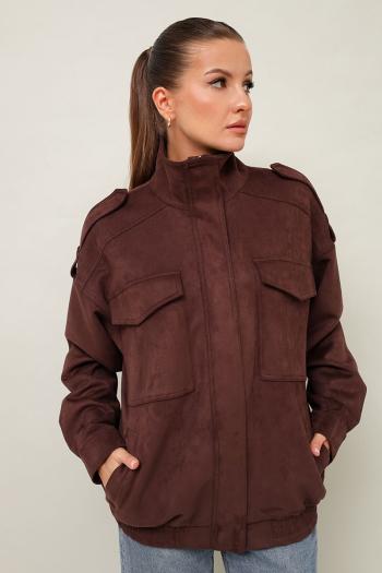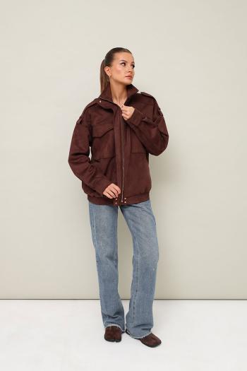 Бомбер актуального прямого кроя, выполнена из качественной экозамши. Воротник-стойка, центральная застёжка на молнию с притачной планкой. По плечевым швам паты. Спереди обработаны нагрудные накладные карманы с клапанами и прорезные карманы с листочкой. Рукава со спущенной линией втачивания плеча, по низу манжеты. Низ бомбера на резинке. Паты, центральная притачная планка и манжеты с застежкой на потайные кнопки. Спинка с кокеткой и средним швом. Бомбер на подкладке. Комментарии к товару