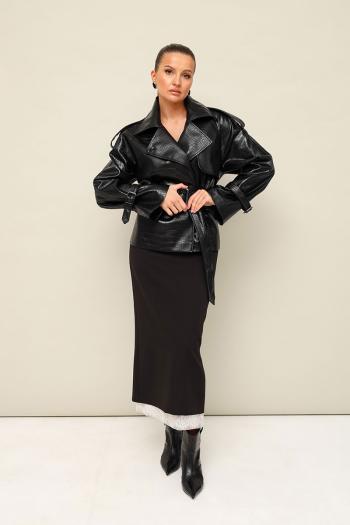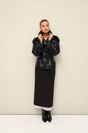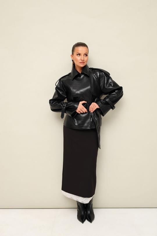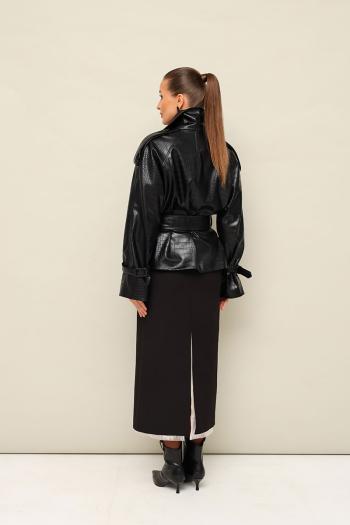 Жакет современного прямого силуэта, двубортный с застежкой на петли и пуговицы. По плечевому шву обработаны погоны. Воротник пиджачного типа с отложными лацканами. Спереди отлетная кокетка. Рукава кроя реглан, с патами по низу, с фиксацией на пряжки. Спинка со средним швом. Изделие на подкладке. В комплекте пояс из основной ткани с пряжкой. Комментарии к товару
