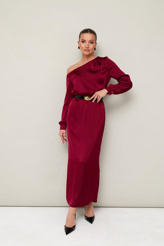 Вечернее платье полуприлегающего силуэта, выполнено из струящейся ткани с благородным матовым блеском. Ассиметричный вырез горловины с открытым плечом. Правый плечевой шов декорирован складками. Платье отрезное по линии талии на резинке. Рукава длиннные с манжетами с застежкой на петли и пуговицы. По спинке в среднем шве юбки обработан разрез. Комментарии к товару