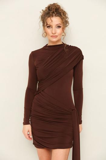 Платье прилегающего силуэта в длине мини, выполнено из эластичной ткани - масло. Горловина с цельнокроеной стойкой. Рукава длинные втачные. Перед и спинка декорированы диагональными деталями со сборкой в области лифа и бедер. Комментарии к товару