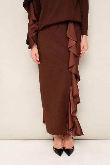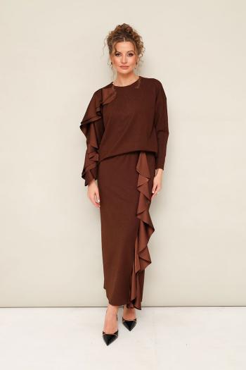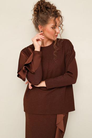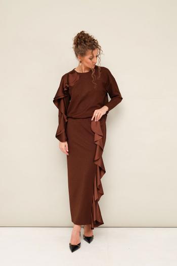 Элегантный трикотажный комплект, состоящий из джемпера и юбки. Джемпер прямого силуэта со спущенной линией втачивания плеча, рукава в длине 7/8. По спинке разрез с застежкой на пуговицу и навесную петлю. Юбка в длине миди с притачным поясом на резинке. Спереди обработан высокий разрез. Комплект декорирован двойным сатиновым воланом по плечевому шву, рукаву и по вертикальному подрезу в юбке. Комментарии к товару