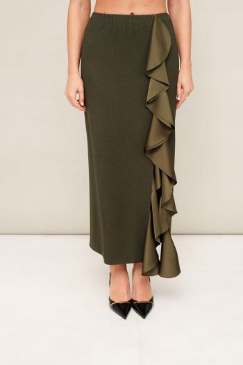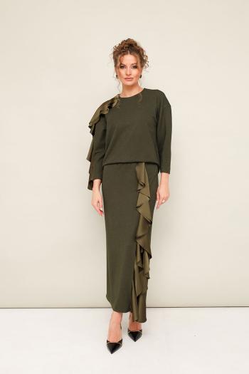Элегантный трикотажный комплект, состоящий из джемпера и юбки. Джемпер прямого силуэта со спущенной линией втачивания плеча, рукава в длине 7/8. По спинке разрез с застежкой на пуговицу и навесную петлю. Юбка в длине миди с притачным поясом на резинке. Спереди обработан высокий разрез. Комплект декорирован двойным сатиновым воланом по плечевому шву, рукаву и по вертикальному подрезу в юбке. Комментарии к товару