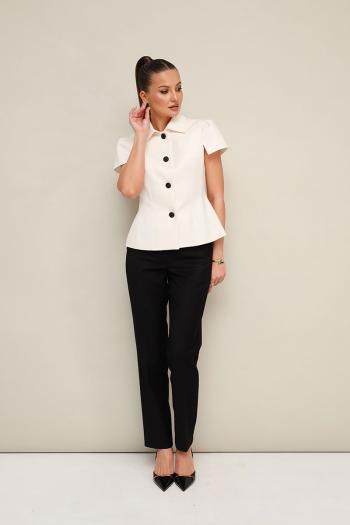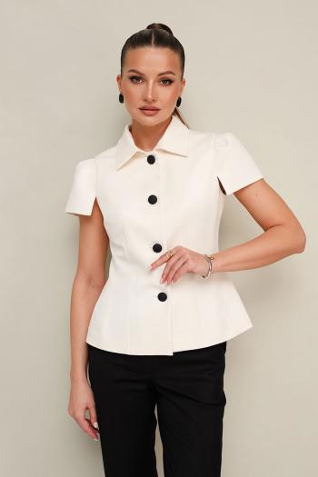 Жакет полуприлегающего силуэта, с центральной застежкой на петли и пуговицы. Отложной воротник со стойкой. Рукава короткие с вытачками по окату и разрезами по низу. Жакет на подкладке.