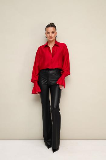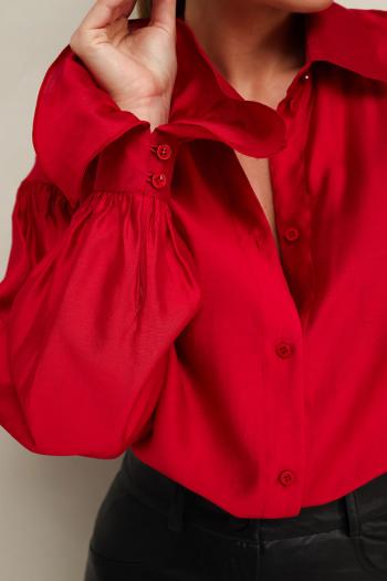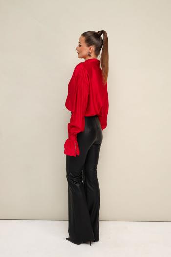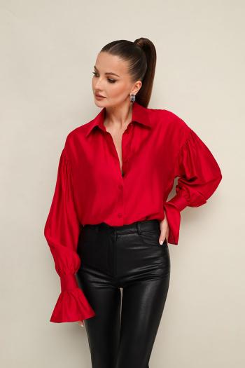 Акцентная блузка прямого кроя, выполнена из натуральной невесомой ткани с матовым блеском. Горловина с рубашечным воротником на отрезной стойке, центральная застежка на петли и пуговицы. Рукава со спущенной линией втачивания плеча, манжеты с рюшей с застежкой на навесные петли и пуговицы. Комментарии к товару