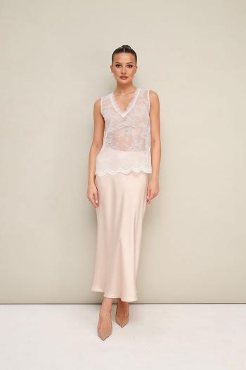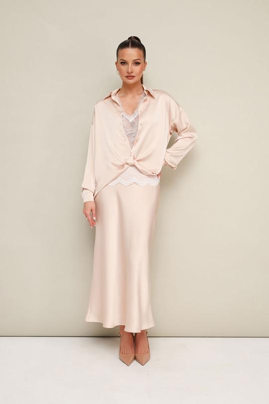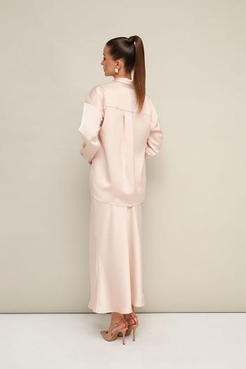 Комплект тройка, состоящий из блузки, топа и юбки. Элегантная блузка прямого кроя, выполнена из струящейся ткани с благородным матовым блеском. Горловина с рубашечным воротником на отрезной стойке, центральная застежка на петли и пуговицы. Перед блузки выполнен с декоративным перекрутом в низжней части застежки. Рукава со спущенной линией втачивания плеча, манжеты с застежкой на петли и пуговицы. Спинка с отрезной кокеткой и бантовой складкой. Юбка с кроем «по косой» в длине миди, пояс на обтачке, застежка в боковом шве на потайную тесьму молнию. Комментарии к товару